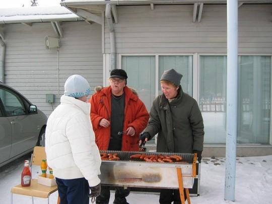 Ei hiihtokisoja ilman grillimakkaraa! Makkaraa myymässä Anja Salomaa (vas.) ja Arja Kaarela.