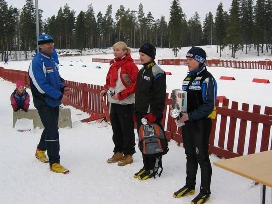 Myös 16-vuotiaiden poikien sarjassa voiton vei selvällä erolla Viialan Virin Jaakko Saarela (oik.). Myös hänelle ojennettiin palkinnoksi matkapuhelin.