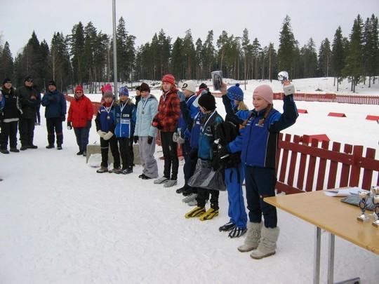 N10-sarjan iloiset hiihtäjät palkintojenjaossa.