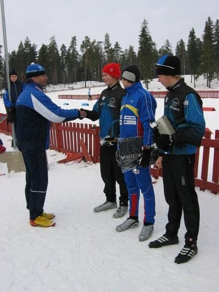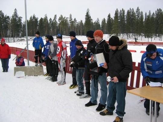M12-sarjan voittaja Artturi Pensasmaa (YlöjU) oikealla ja hänen vierellään sarjan muut palkitut hiihtäjät.